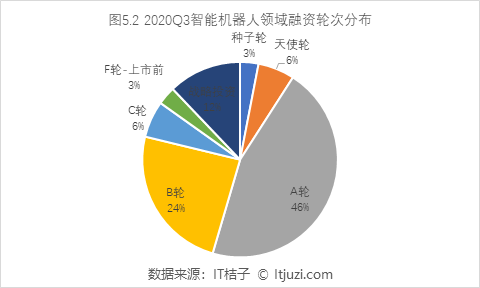 2020 年第三季度中国智能机器人领域共发生 33 起投资,以 A 轮、B 轮为主,分别占比 46% 和 24%。