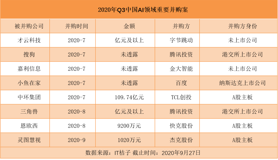 7 月,才云科技被字节跳动收购,搜狗被腾讯投资收购,嘉利信息被金大智能收购,小鱼在家被百度收购,中环集团被 TCL 收购;8 月三角兽被腾讯投资收购,恩欧西北快客股份收购;9 月,灵图慧视被杰克股份收购。
