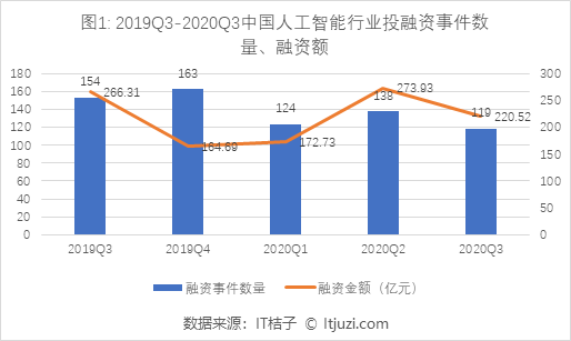 2020 年第三季度中国人工智能领域融资事件数有 119 起,同比下降 22.7%,环比下降 13.8%;融资金额约 220.52 亿元,同比下降 17.19%,环比下降 19.50%;平均单笔融资额约为 1.85 亿元,上个季度约为 1.99 亿元,去年同期约为 1.73 亿元。
