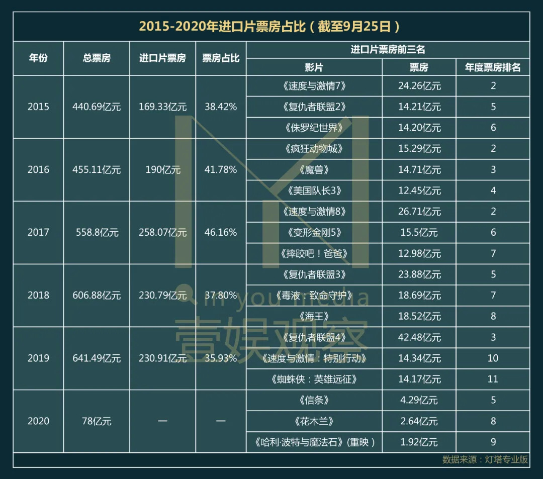 面向未来,对中国电影市场而言,好莱坞分账大片恐将缺失半年到一年时间。另一方面,随着高口碑电影《信条》、迪士尼为中国“量身定做”的《花木兰》两部顶级分账片均在中国票房纷纷折戟,二者分别以4.3亿、2.7亿元票房暂列中国年度票房5/7位(历史上的分账片最差排名),且在国庆档后恐被甩出票房前十,好莱坞分账片在中国已经不再是“救世主”。