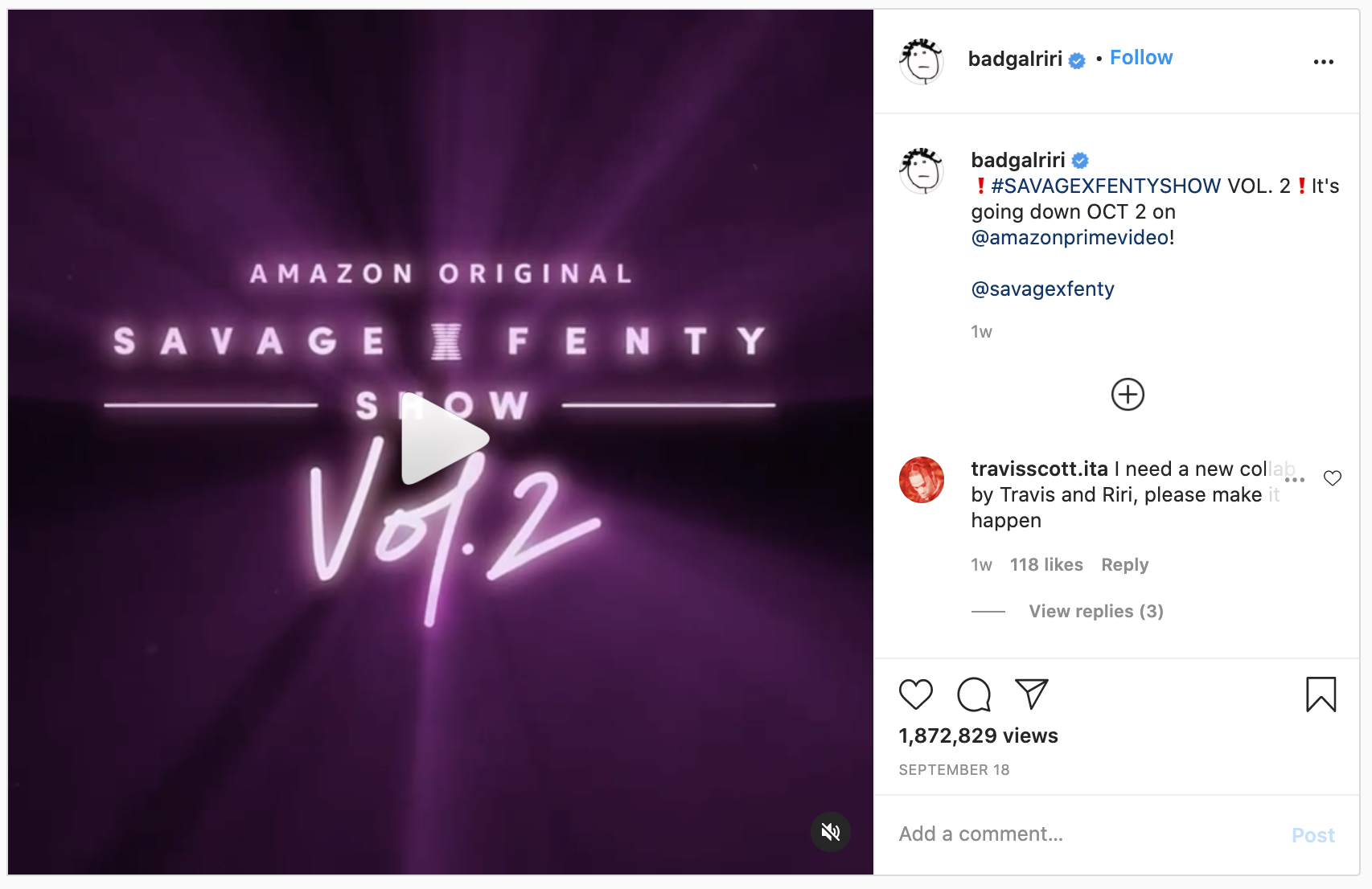 此前,蕾哈娜在Instagram上公布了这场内衣时装秀还将继续和Amazon Video联合呈现。表演嘉宾的阵容将包括嘻哈明星Travis Scott, 西班牙唱作歌手Rosalía, 美国歌手Miguel等一系列的明星。