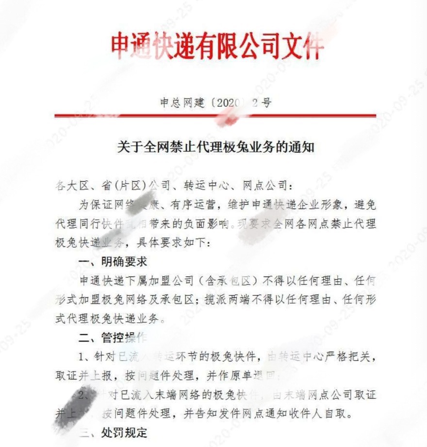 界面新闻接到爆料称,申通快递总部9月25日发布内部通知,要求全网禁止代理极兔速递的业务。