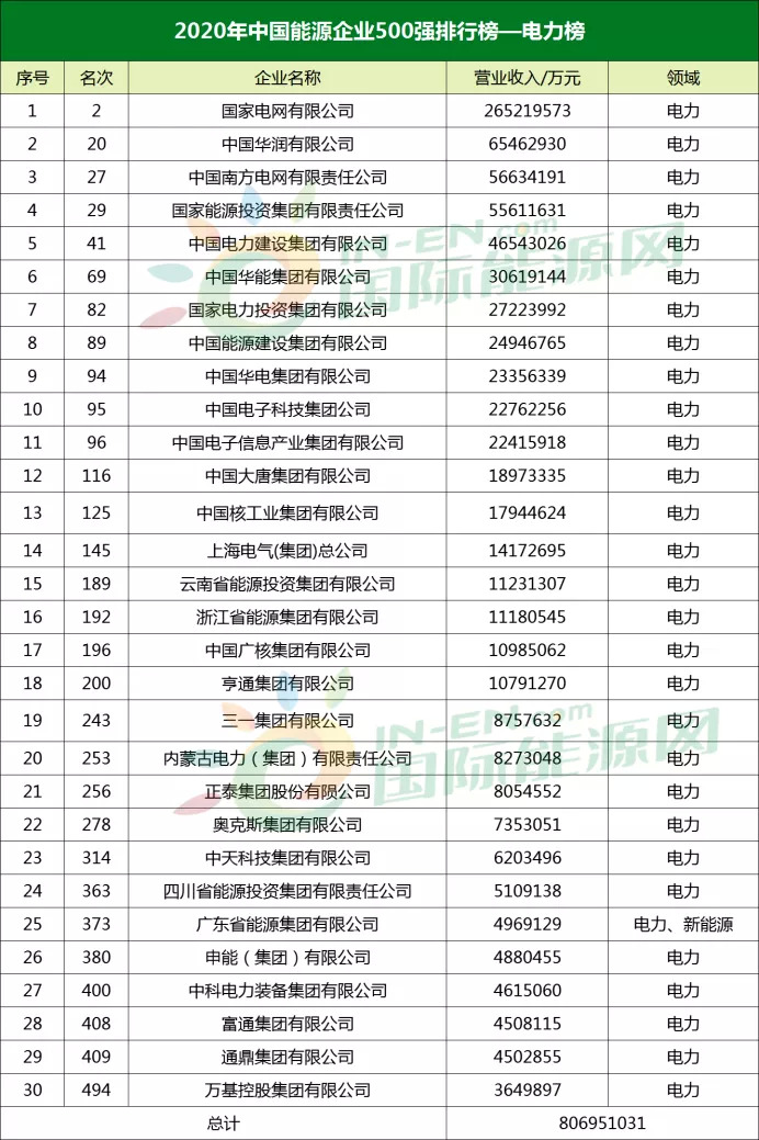 国际能源网记者在统计榜单时发现,此次共有30家电力企业上榜,其中有18家企业营业收入超过1千亿元。从电力榜单整体情况看,行业发展态势良好,两大电网,五大发电集团均在500强的排名里位于前半段位置。