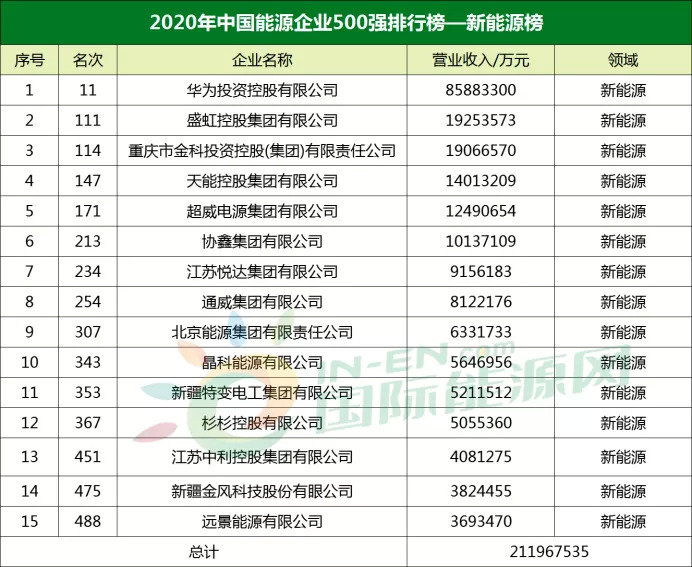据国际能源网记者统计,共有15家新能源企业上榜,其中华为以8588.33亿元的营业收入位居新能源榜的榜首,500强总排名11名,较去年上升了4个名次。近年来,华为发展迅速,尤其在智慧能源领域,表现更为出色。据华为发布的2020年上半年业绩报告显示,在上半年中华为的营业收入为4507亿元,比2019年同期增长了13.67%;上半年净利润为431亿元,比2019年同期增长了23.49%,这也意味着,华为上半年日赚近2.37亿元。