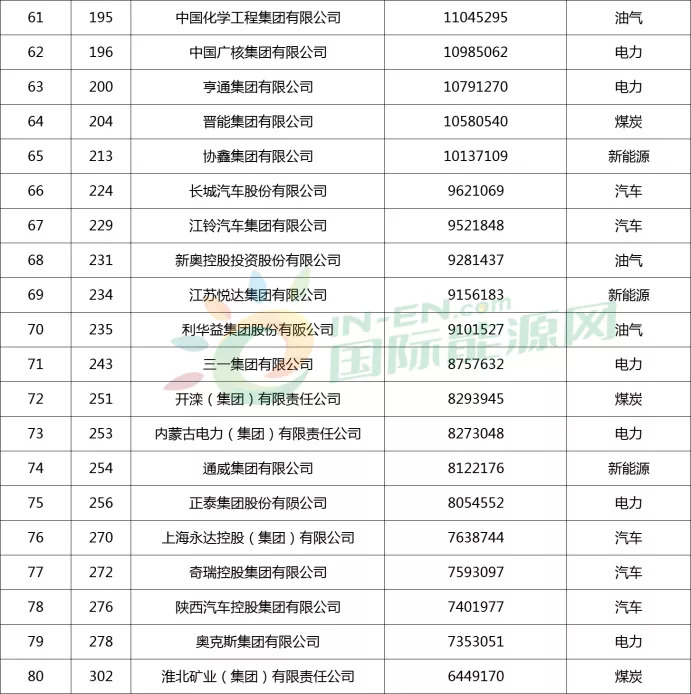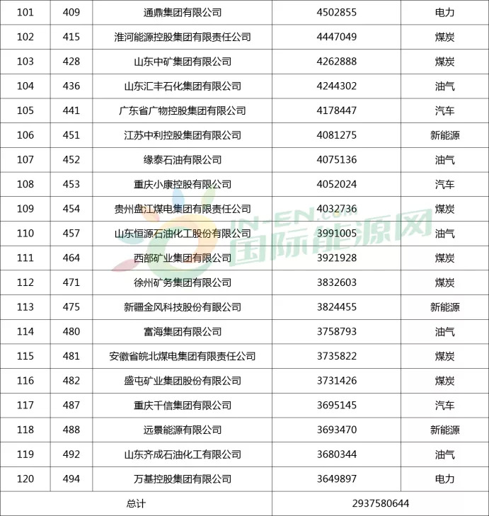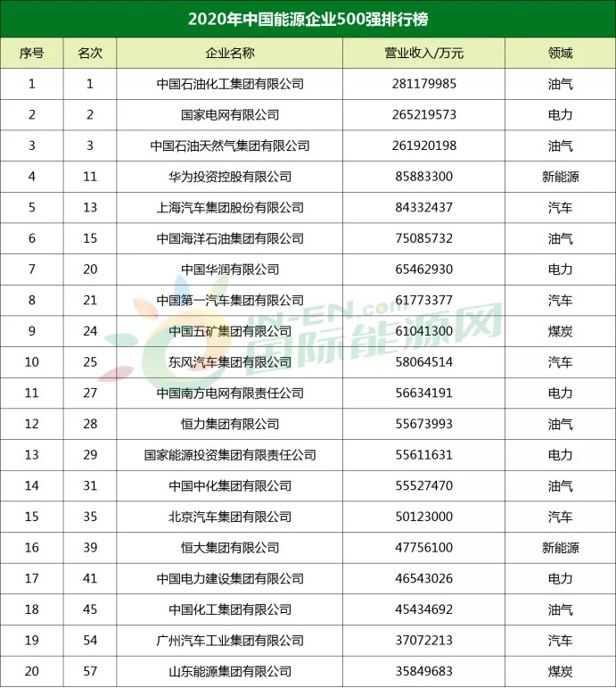 9月28日,中国企业联合会、中国企业家协会发布“2020中国企业500强榜单”。国际能源网记者统计,此次共有华为、比亚迪、超威、亨通、协鑫、通威、正泰、晶科、特变、远景等120家能源企业上榜,总营收高达293758亿元,其中中国石化、国家电网、中国石油分别以28118亿元、26522亿元、26192亿元的营收再次包揽前三名。