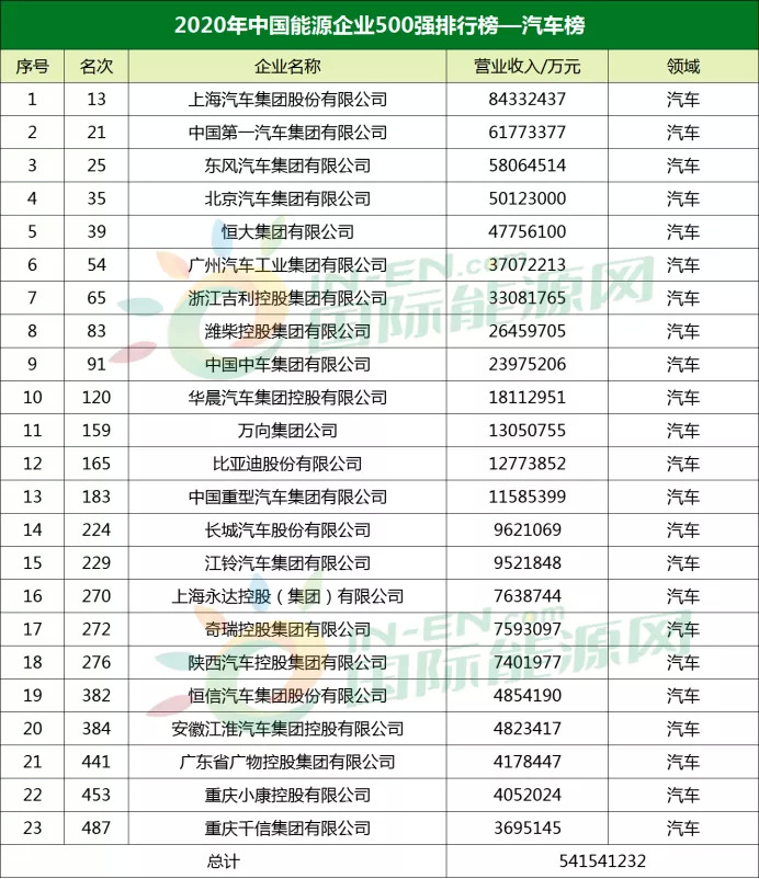 据国际能源网记者统计,共有23家汽车企业进入了500强榜单,其中,营收超过千亿的企业有13家,上海汽车、第一汽车和东风汽车三家公司位列榜单前三。