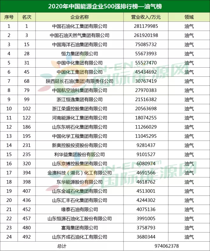在此次榜单中,共有24家油气类企业入选2020中国企业500强,其中,中石化、中石油和中海油分别以288117亿元、26192亿元和7508亿元位列前三,值得注意的是,中海油虽然与中石化、中石油并称为“三桶油”,但其营收与另外“两桶油”还有很大的差距。