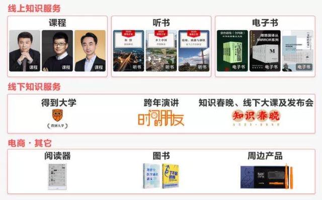 而这其中作为主力的得到APP,共有319门课程、159名签约讲师、2千余本听书和超过3万本电子书,包括《李翔知识内参》《薛兆丰的北大经济学课》《万维钢·精英日课》《刘润·5 分钟商学院》《吴军·硅谷来信》等热门课程。