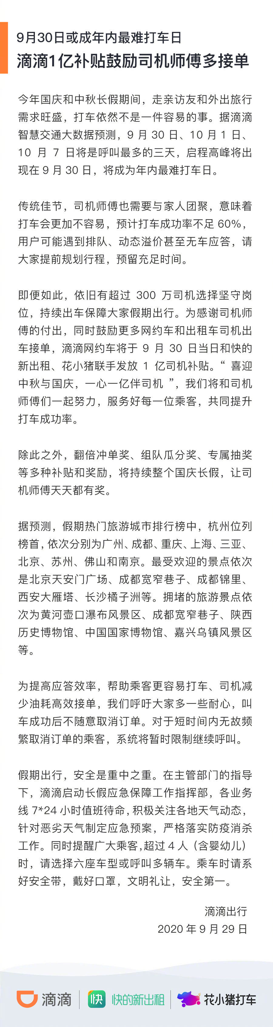 滴滴:9月30日或成年内最难打车日,1亿补贴鼓励司机多接单