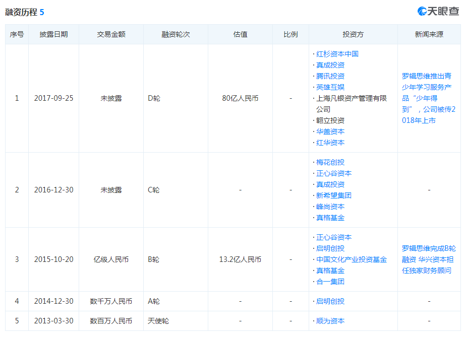 值得注意的是,在罗辑思维和得到APP崛起的过程中,资本的力量无处不在。天眼查显示,思维造物此前共获得了5轮外部融资,投资方包括顺为、启明创投、红杉、真格基金、华兴资本、中国文化产业投资基金等众多知名投资机构。