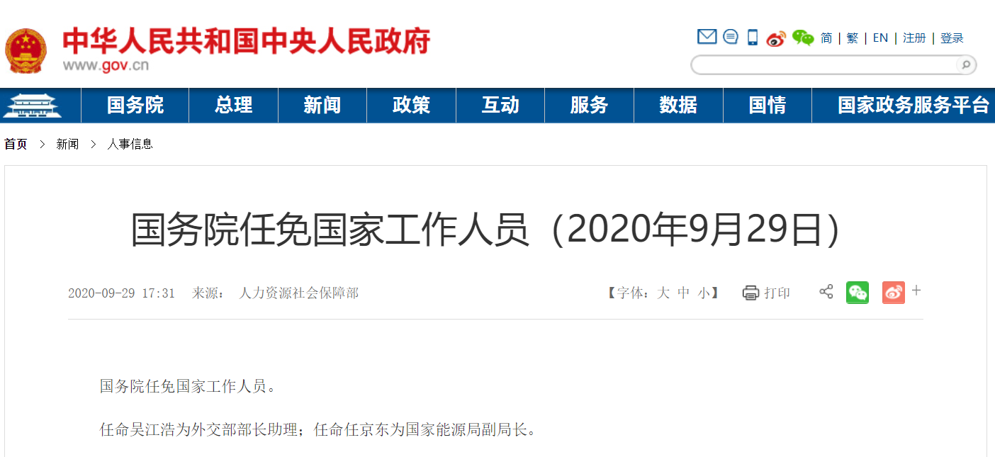 中国政府网消息,国务院任免国家工作人员。任命吴江浩为外交部部长助理;任命任京东为国家能源局副局长。
