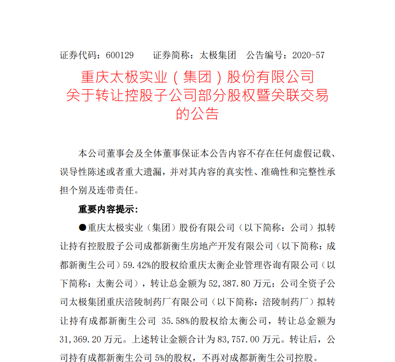 2019年10月22日晚间,太极集团发布公告,太极集团及全资子公司涪陵药厂拥有位于成都双流区西航港街道大件路白家段59号的土地共约66亩,原为控股子公司太极集团四川太极制药有限公司生产厂区。因四川太极“退城入园”搬迁,现该厂区已处于闲置状态。为整合闲置资产,拓宽利润来源,公司拟与涪陵药厂以拥有的成都地块及地上附着物经评估作价出资组建成都新衡生房地产开发有限公司。太极集团出资6388万元,占成都房产公司注册资本的63.88%;全资子公司涪陵药厂出资3612万元,占注册资本的36.12%。太极集团实际持有成都房产公司100%的股权。
