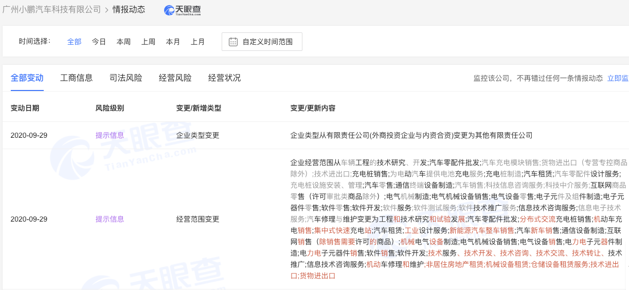 据天眼查APP显示,9月29日,广州小鹏汽车科技有限公司发生经营范围变更,企业经营范围新增集中式快速充电站、新能源汽车整车销售、机动车修理和维护、非居住房地产租赁、机械设备租赁、仓储设备租赁服务等。此外,该公司企业类型由有限责任公司(外商投资企业与内资合资)变更为其他有限责任公司。
