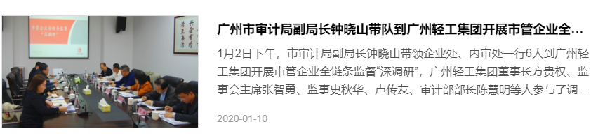 广州轻工集团官网信息显示,早在今年1月,广州市审计局副局长钟晓山带领企业处、内审处一行6人到广州轻工集团开展市管企业全链条监督“深调研”。