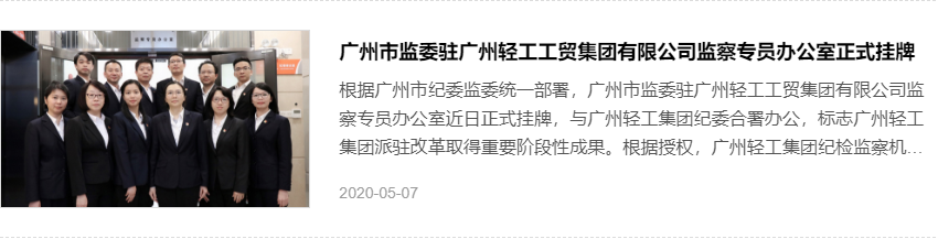 5月份,广州市监委驻广州轻工工贸集团有限公司监察专员办公室正式挂牌,与广州轻工集团纪委合署办公。