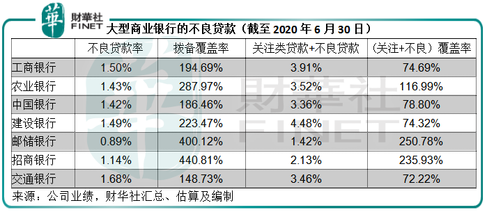 见下表,单以不良贷款率看,大型商业银行的拨备覆盖率相当充裕。但是,如果加上关注类贷款,部分银行的拨备覆盖率显得不太足够(除了招行和保守的邮储银行)。