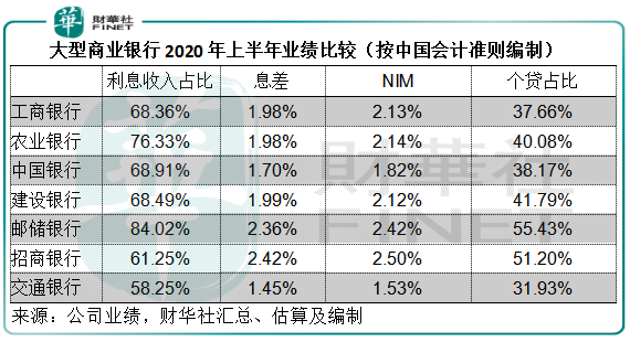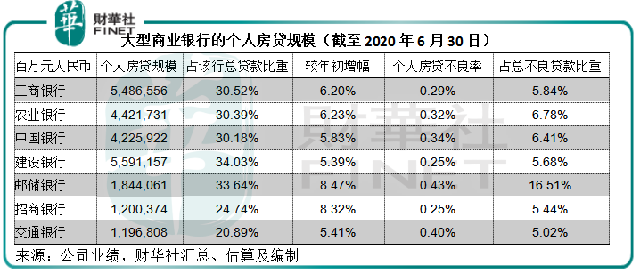 个人业务一般占大型商业银行的三成业务以上,其中以零售业务为主的招商银行(03968-HK,600036-CN)以及邮储银行(01658-HK, 601658-CN),个人贷款更占总贷款的一半以上。而房贷则占了个人贷款的大部分。