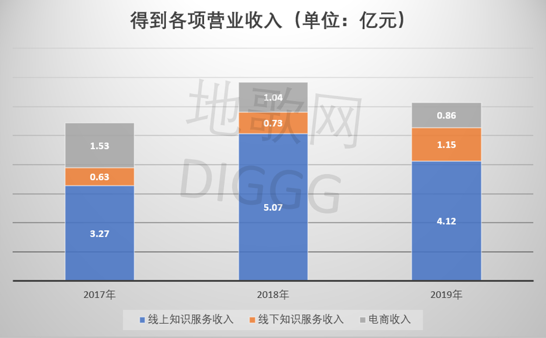 截止到目前,得到覆盖了线上的知识产品、付费听书,以及线下的得到大学、跨年演讲等业务。另据招股书显示,2019年得到总营收6.28亿元,同比下滑14.91%。