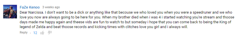 当Nacissa Wright说自己不再当一名快速通关玩家后,她在Twitch上就少了很多粉丝,甚至还有人在她的Youtube主页下谩骂她。