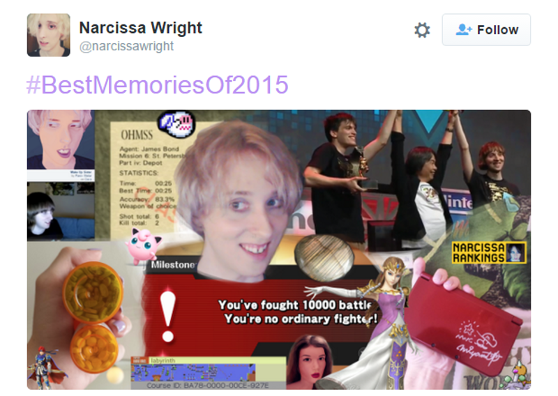 Narcissa Wright非常擅长某些特定的游戏。她告诉记者,她在游戏堆里长大,四岁就开始接触游戏,比如在N64上的《任天堂全明星大乱斗》和Gamecube上相似的游戏。一开始她只是和朋友比赛谁更厉害,打着打着就开始参加比赛,那时还是2005年。