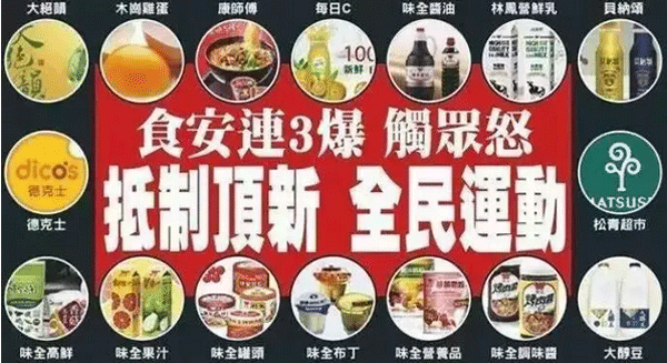 顶新在台湾的厄运,从2013年11月开始。当月,食用油厂商大统长基被曝在油品内掺铜叶绿素,顶新旗下的味全、正义公司则被曝曾向大统购油,激起不少公愤,但当时身兼味全集团董事长的魏应充出面道歉后,事情归于平静。