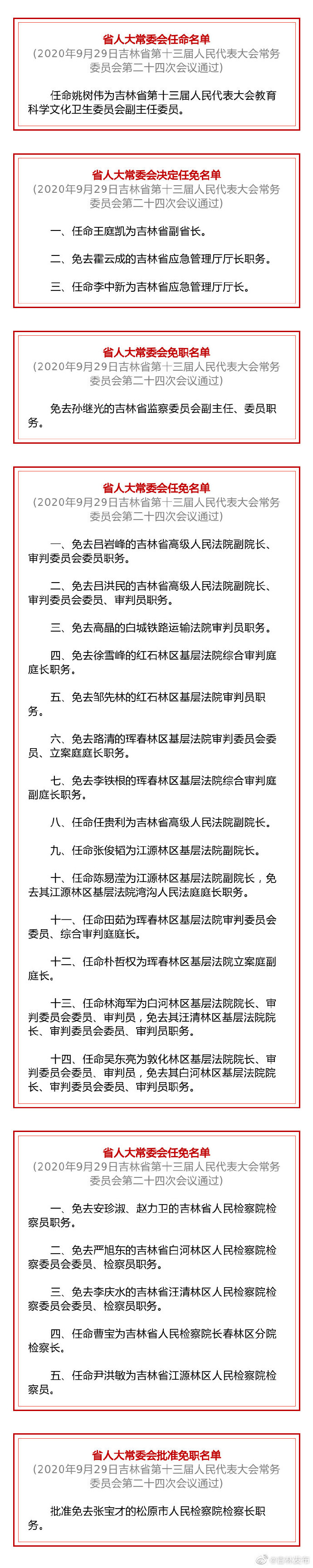 吉林省人民政府新闻办公室官方微博@吉林发布 9月30日发布省人大常委会决定任免名单。