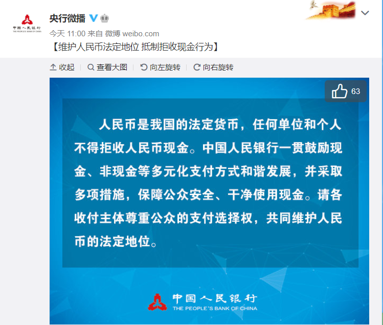 9月30日,中国人民银行办公厅官方微博发文称,人民币是我国的法定货币,任何单位和个人不得拒收人民币现金。请各收付主体尊重公众的支付选择权,共同维护人民币的法定地位。