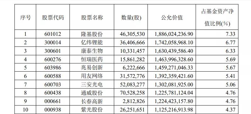 在十大重仓股中,只有两只股票近一个月呈上涨趋势,隆基股份和通威股份,分别上涨19.84%、13.69%,其余八只股票皆为下跌趋势,下跌幅度最大的是长春高新,下跌19.64%,其次是紫光股份和康泰生物,分别下跌17.77%、11.91%。