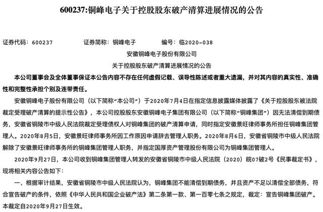 9月29日,铜峰电子(600237.SH)发布公告称,公司收到控股股东铜峰集团转发的法院宣告集团破产的《民事裁定书》,该裁定自2020年9月27日生效。