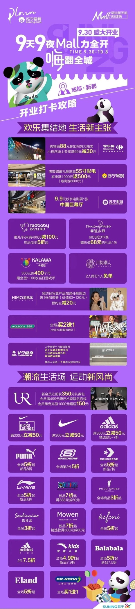 除了广场的整体活动,品牌也推出了空前力度的优惠活动。运动品牌全场5折起,Nike Kicks Lounge、Nike、Adidas满300立减80;女装及童装品牌全场3折起,新品7.5折起,优衣库满300赠50元优惠券,UR新会员注册获350元礼券包;美食享受吃100送100的超值福利,指定饮品买1送1;购家电3C方面满1000元送500元,还有机会抽取55寸液晶电视等多重好礼。加入苏宁易购广场会员还可享V9健身、儿童游乐免费体验券。