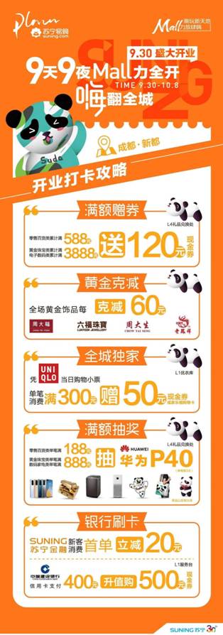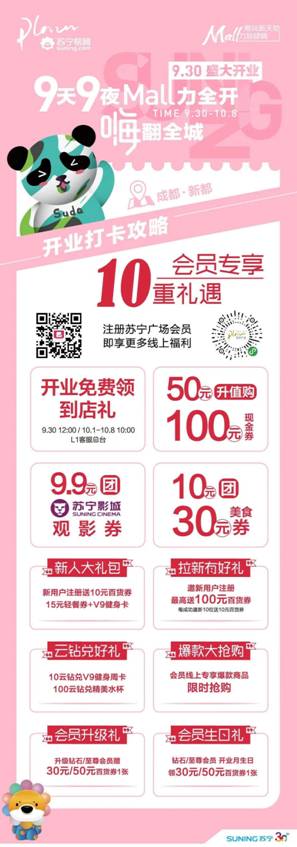 新都苏宁易购广场的盛大开业,将为新都人民带去全新的潮流消费体验,助推新都进入全新的购物中心商业时代,同时也将通过商业核心能力与优质资源整合能力,助力区域消费升级,实现新都人民美好生活的诉求,为城市发展注入新动能。未来,新都苏宁易购广场广场还将为新都带来更多惊喜,此刻加入新都苏宁易购广场,享受更多时尚潮玩活动和消费优惠!