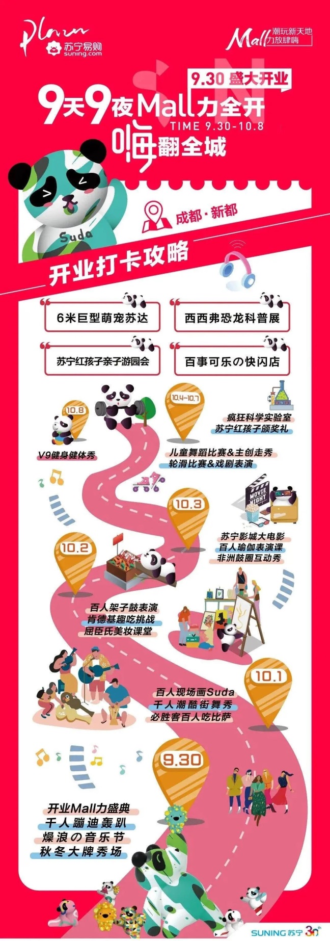 开业期间,除了丰富的促销活动,新都苏宁易购广场还以“潮玩新天地,Mall力放肆嗨”为主题,为消费者掀起了一场全民狂欢的活动盛典。六米Suda美陈空降新都带来全新气象,彩虹堂乐队嗨翻全场,从Rock到Pop,从Funk到Jazz,从Reggae到Blues,千人蹦迪派对将现场气氛推向另一波高潮。