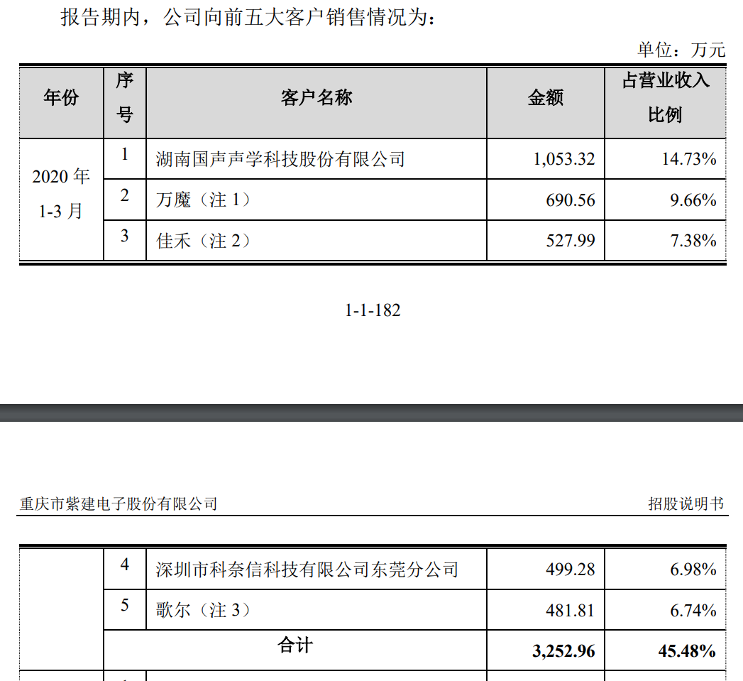 数据显示,紫建电子2020年一季度前五客户的涉及金额占总营业收入比例45.48%,其中的万魔,经营自有耳机品牌业务和声学产品ODM业务,万魔与紫建电子合作项目主要为其ODM客户华为、小米、OPPO等品牌产品的耳机电池。第一大客户湖南国声与紫建电子的合作项目包括OPPO、华为、小米、镭蛇、酷我等下游品牌的耳机电池,湖南国声作为万魔的合作加工厂商之一,其与公司的大部分订单(包括OPPO、华为、小米项目)系由万魔指定湖南国声向紫建电子下达。紫建电子未来来自湖南国声的订单的规模一定程度取决于万魔与公司合作方式。