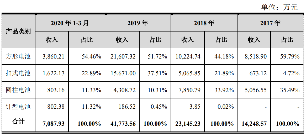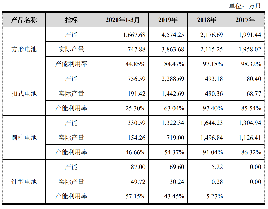 不过值得注意的是,紫建电子目前的产能利用率并没有打满。数据显示,紫建电子方形电池的产能利用率2019年时为84.4%,2020年一季度时数据为44.85%;扣式电池2019年和2020年一季度的产能利用率分别为63.04%和25.3%;圆柱电池这两个数据分别为54.37%和46.66%;针型电池2019年和2020年一季度的产能利用率数据则为43.45%和57.15%。