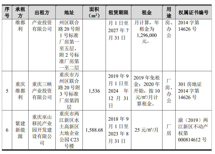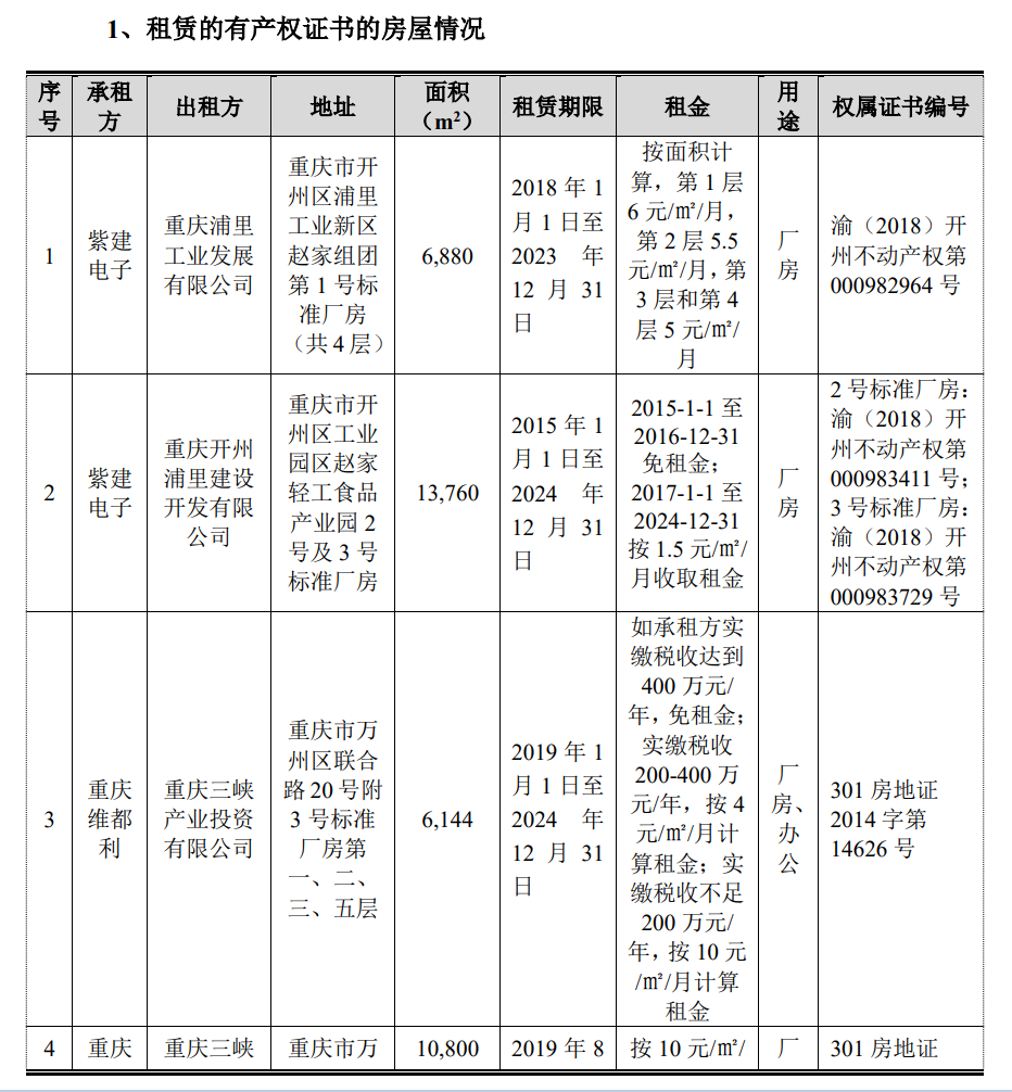 记者注意到,紫建电子租赁的厂房不少,除了上述3处无产权证书的房屋外,大量有产权证书的房屋,租赁到期日也就在近几年里,到期日较为集中。比如1588.68平米的厂房重庆市两江新区水土高新区大地企业公园C23号楼,到期日为2023年8月31日;6880平米的厂房重庆市开州区浦里工业新区赵家组团第1号标准厂房(共4层),租赁到期日为2023年12月31日;另外13760平米的厂房重庆市开州区工业园区赵家轻工食品产业园2号及3号标准厂房,6144平米的厂房办公楼重庆市万州区联合路20号附3号标准厂房第一、二、三、五层,以及1536平米的厂房办公楼重庆市万州区联合路20号附3号标准厂房第四层,这3处的租赁到期日均为2024年12月31日;只有占地10800平米的厂房办公处重庆市万州区联合路20号附1号标准厂房第一至五层、附2号标准厂房第一至二层,其租赁到期日为2027年7月31日,相对时间较长。