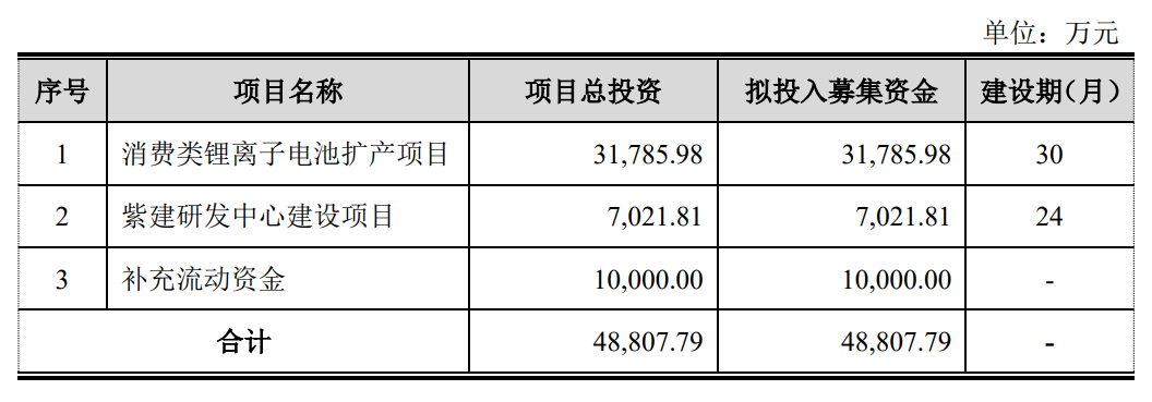 此番,紫建电子计划向社会公众公开发行不超过1770.08万股人民币普通股股票,发行后,募集资金将按照轻重缓急顺序投入“消费类锂离子电池扩产项目”、“紫建研发中心建设项目”、“补充流动资金”这3个项目上,合计拟投入4.88亿元的募资,其中的“消费类锂离子电池扩产项目”,拟投入募资金额就为3.18亿元。