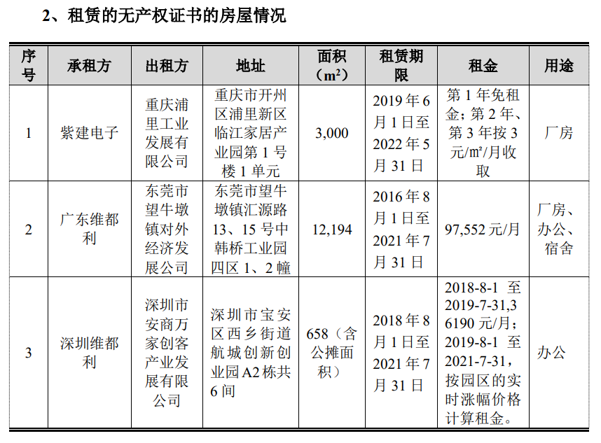 实际上,广东维都利租赁的这处场地的租赁期也就到2021年的7月31日,即便没有搬迁,也会面临是否是否续租的问题。除此之外,界面新闻发现紫建电子租赁的无产权证书的房屋还有重庆市开州区浦里新区临江家居产业园第1号楼1单元,占地3000平米,用途厂房,2022年5月31日租赁到期;以及深圳市宝安区西乡街道航城创新创业园A2栋共6间,占地658平米(含公摊),用途办公,租赁到期时间同样很近,为2021年7月31日。紫建电子表示,这两处5年内没有改变房屋用途或拆除计划,也没有列入政府拆迁或更新规划,所属地块亦不涉及征地拆迁项目,厂房这厢租赁到期后公司有优先租赁权,办公处周边租赁市场较为活跃,即便无法使用也影响不大。