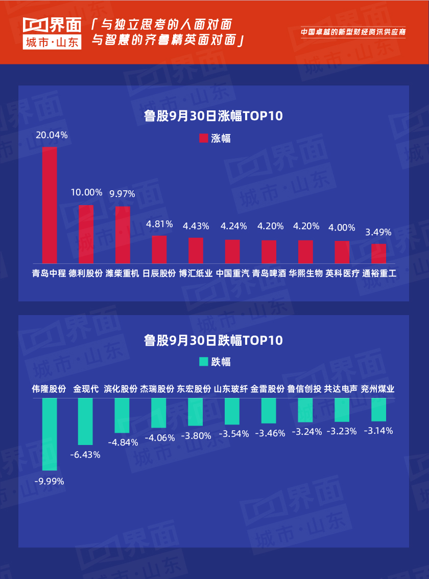 受大盘影响,9月30日,山东省内沪深股票有79只个股上涨,131只下跌,青岛中程涨幅最高达20.04%。