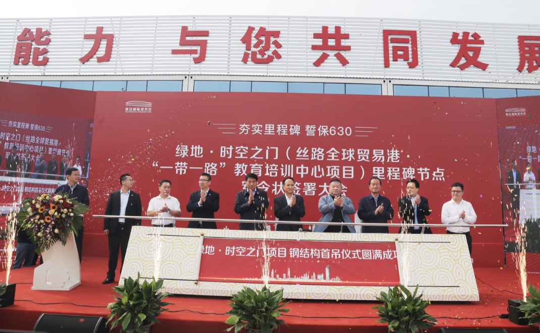 在和文全副市长的起吊指令下,绿地丝路全球贸易港商业项目钢结构吊装正式开始,标志着绿地丝路全球贸易港商业项目全面进入结构施工的快速推进阶段。按照计划节点,交易馆及商业地块将于2020年年底完成商业主体结构封顶;超高层及公寓将于2021年6月完成主体结构封顶;2021年6月底整体工程亮灯!