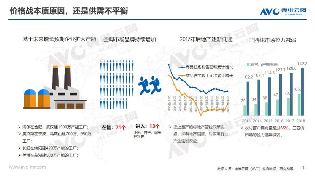 第三次价格战从2019年开始,此时的行业已进入存量竞争时期。去年2月份后,美的率先展开降价促销,直到双11格力30亿补贴活动达到价格战的最高潮。分析本次价格战发生的根本原因,还是供需不均衡导致的结果。首先,基于对未来的增长预期,空调主力厂商纷纷在扩大产能;其次,空调行业2000亿以上的市场规模和未来的发展前景吸引了更多跨界品牌进入,使得行业供给端在扩张,但国内的需求拉力却在下降。2017年之后,在房地产管控政策的影响下,商品住宅的竣工面积和销售面积下滑,房地产对空调市场的拉力下降;最后,随着农村市场百户拥有量的逐年提升,三四线市场的拉力也在逐年减弱。