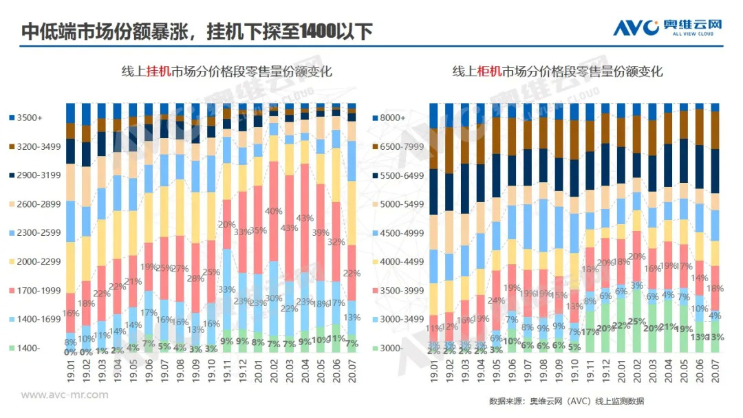 另外,此次价格战还呈现出线上的价格降幅高于线下,挂机的降幅大于柜机的特点,线上挂机产品价格下探至1400以下,中低端产品的销售贡献度在价格战后进一步提升,而去年双11后,线上挂机1400以下的价格段贡献度接近10%。