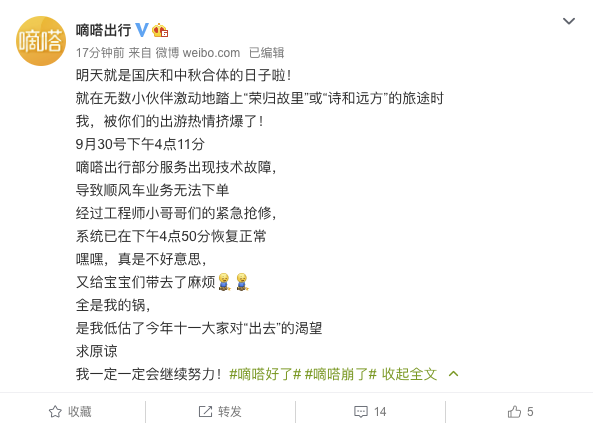 嘀嗒出行官方微博30日晚间消息,9月30号下午4点11分,嘀嗒出行部分服务出现技术故障,导致顺风车业务无法下单,经紧急抢修,系统已在下午4点50分恢复正常。
