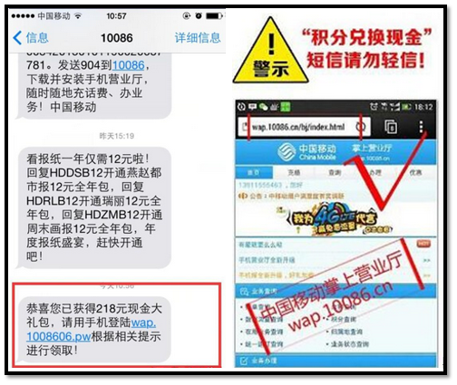 1、“伪基站”诈骗:伪基站诈骗近2年非常猖獗也是最容易成功的诈骗手段,伪基站可以伪装成任意的号码,包括110、120、955××等公共服务和银行服务号码。并且由于智能手机短信都是采用会话显示模式,诈骗短信的内容会和真实短信混在一起,很容易让用户混淆。在诈骗类伪基站短信中,37.3%的诈骗短信是虚假积分兑换短信,36.5%的诈骗短信假冒银行,20.4%的诈骗短信内容为冒充熟人、房东、亲戚。他们发布一些移动积分兑换礼品、银行卡存在安全风险、车票订购有误、冒充亲人好友等信息,然后附上假冒官方网站的链接或者带有病毒的非法链接,吸引用户点击诈骗链接。