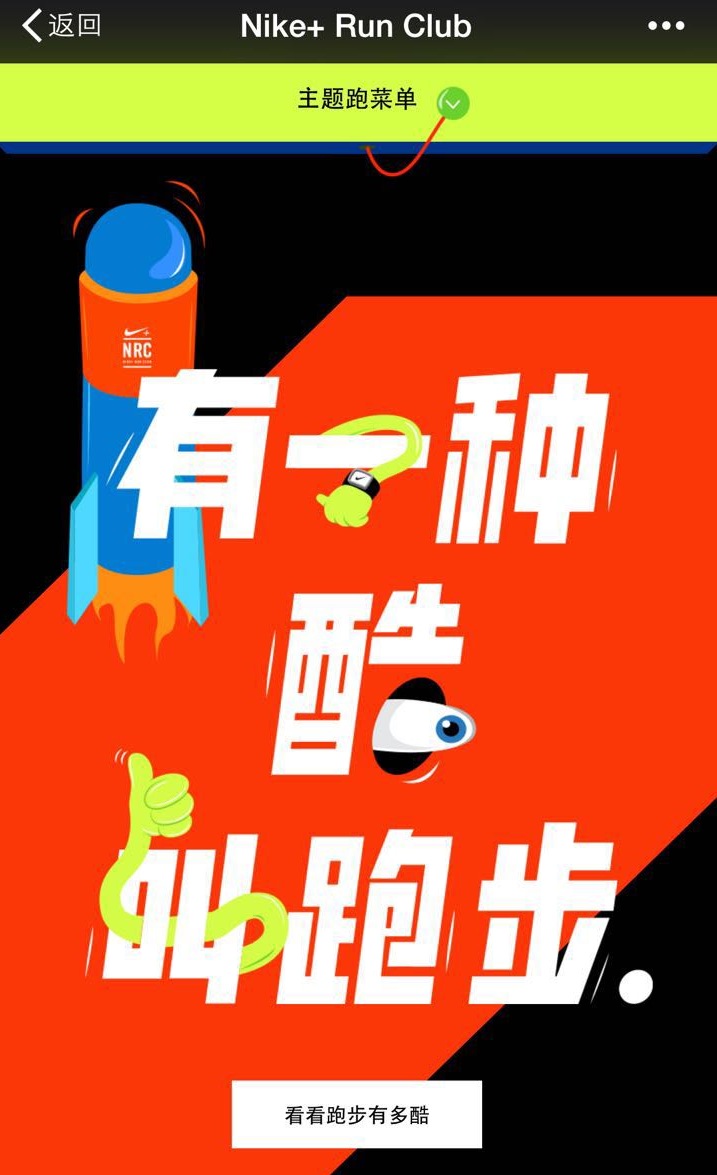 50 年后,有关跑步运动的精髓仍旧不变,但其表现形式已经革新。1月初,Nike+ Run Club(简称 NRC)的微信公众号推出了一份新潮、精炼且易读的《菜鸟跑者成长计划》。这个计划就像是个游戏,只需要与NRC app关联,通过完成任务、解锁关卡,10 个不同的“主题跑”也许会让你在不知不觉中养成跑步习惯。