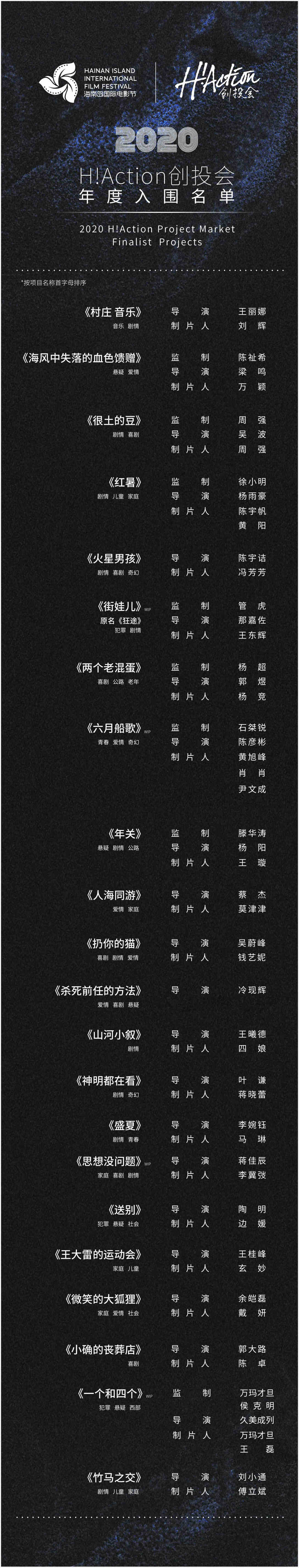 9月30日,2020年海南岛国际电影节·H!Action创投会公布入围电影项目。编剧阿美、制片人陈洁、制片人顿河、导演韩杰、编剧李媛担任评审,从35个入围项目评审的项目中评选出22个电影计划,成为2020 H!Action创投会年度入围电影项目。