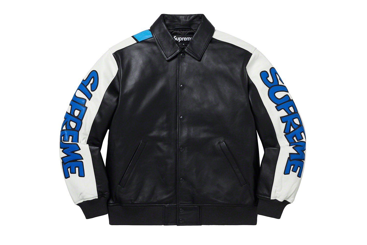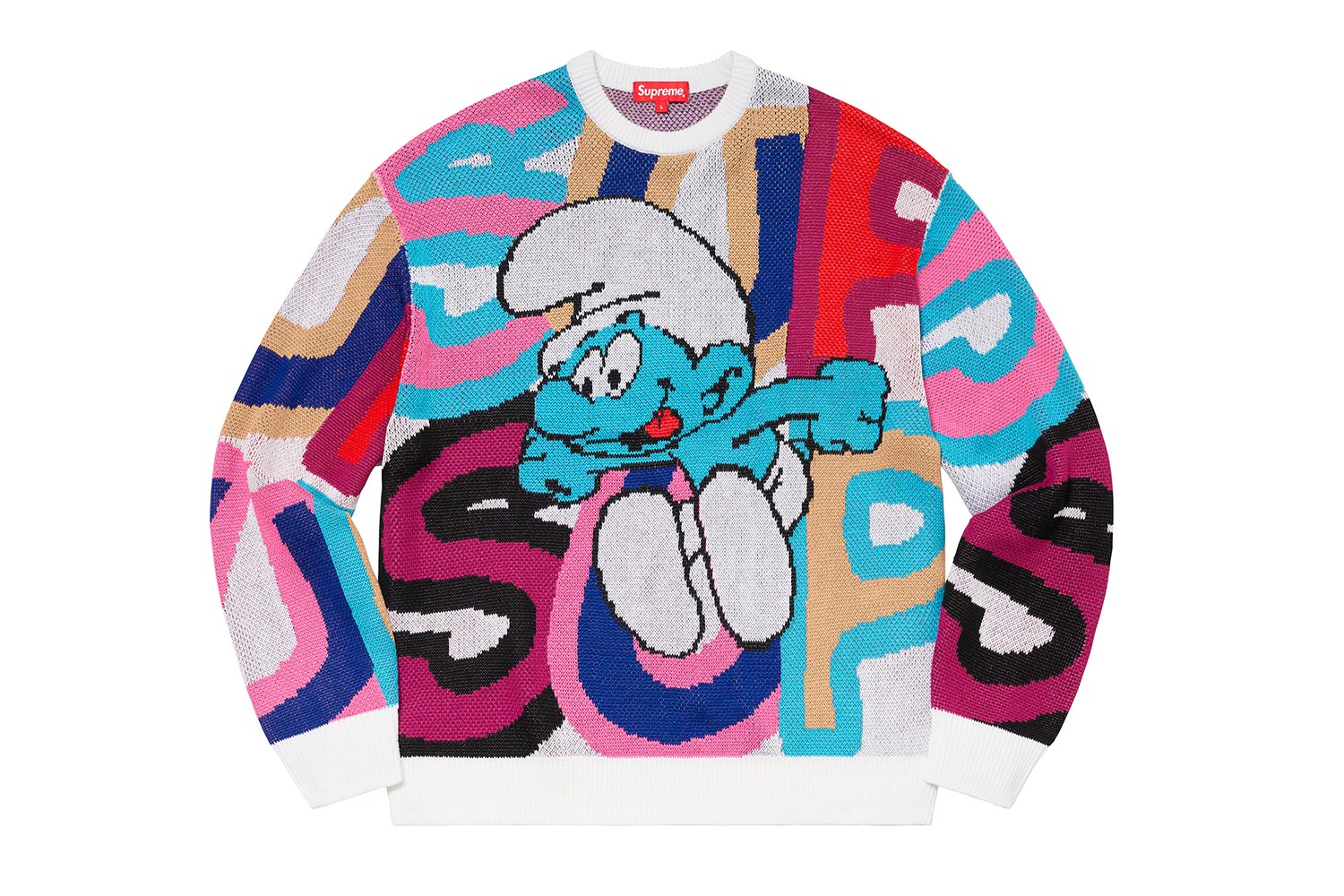 整个系列包含卫衣、毛衣等成衣以及帽子、滑板等配饰。不过,其中最值得关注的当属于一件印蓝精灵图案的夹克和两件多色毛衣。夹克以皮革制成,前部为带有机车感的黑色,后部则在纯白底色上绘画了巨大的蓝精灵图案,并将Supreme的字母Logo以动画风格装饰在两侧袖子上,非常拉风。