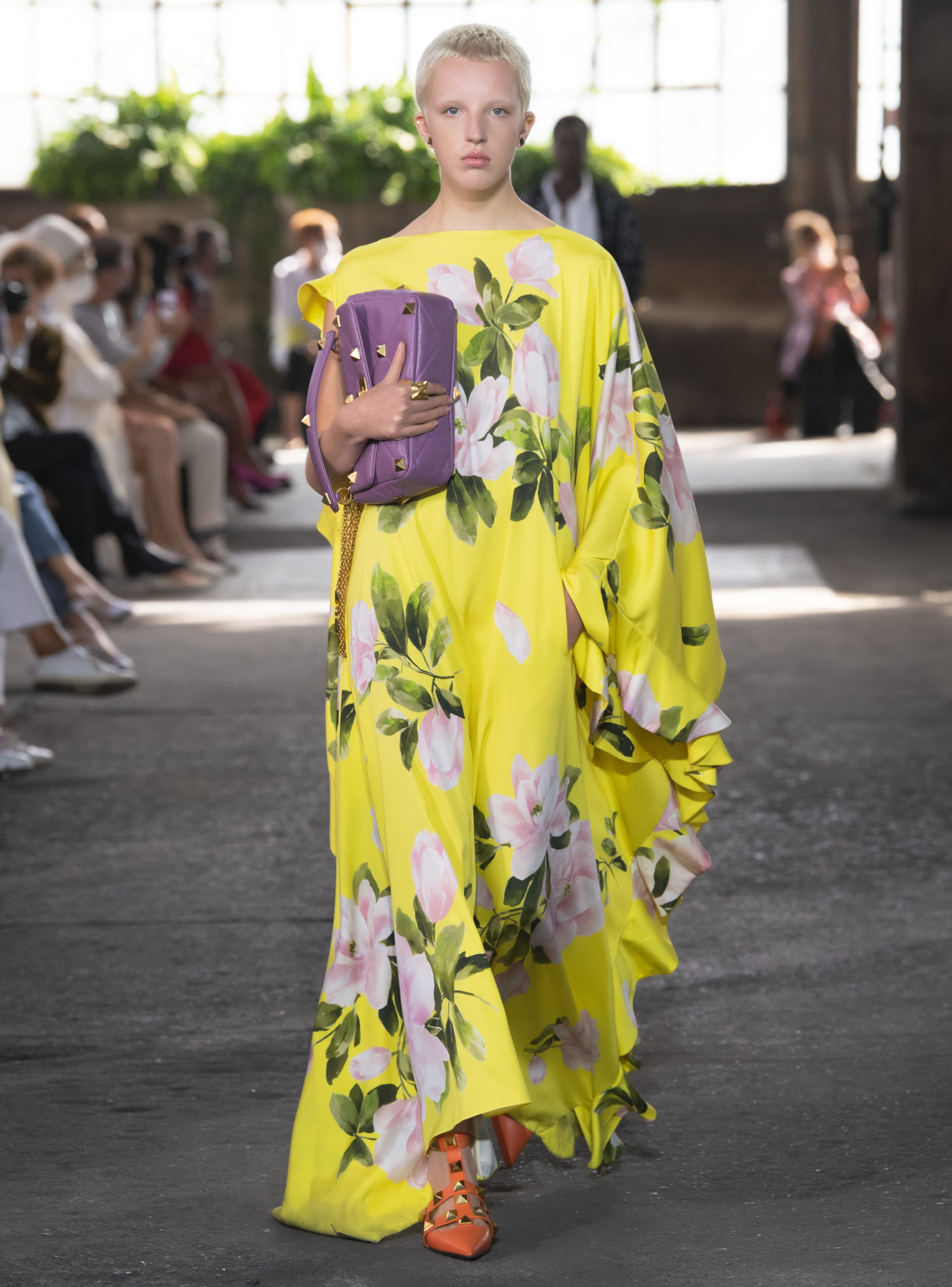 近日发布的2021春夏系列也不例外。大秀在米兰Fonderie Macchi铸铁厂中举行,但粗犷的建筑轮廓和内部装饰与盛放的鲜花互相映衬,以极度浪漫的手法表达出一种废墟上希望重生的浪漫主义理念。