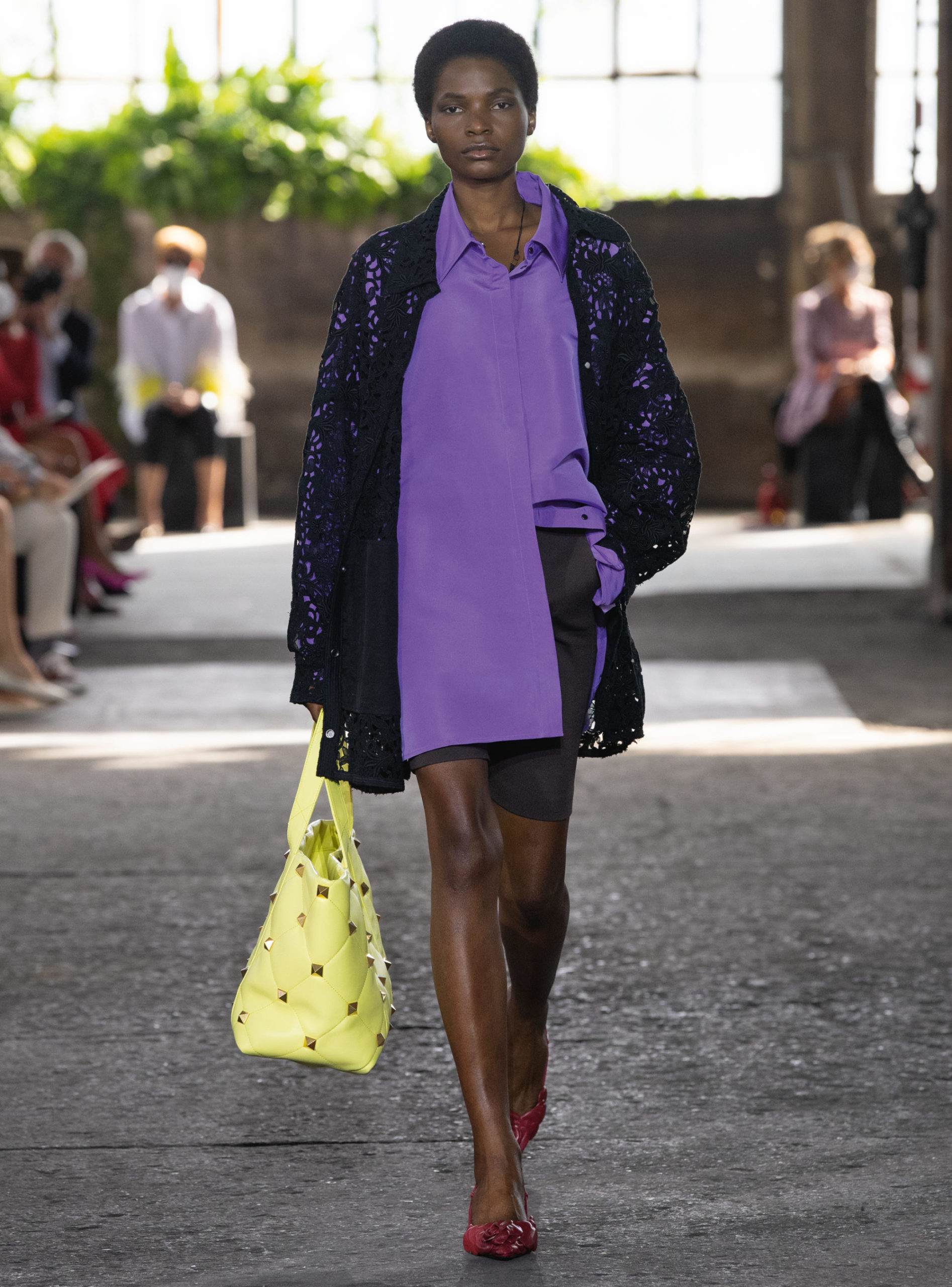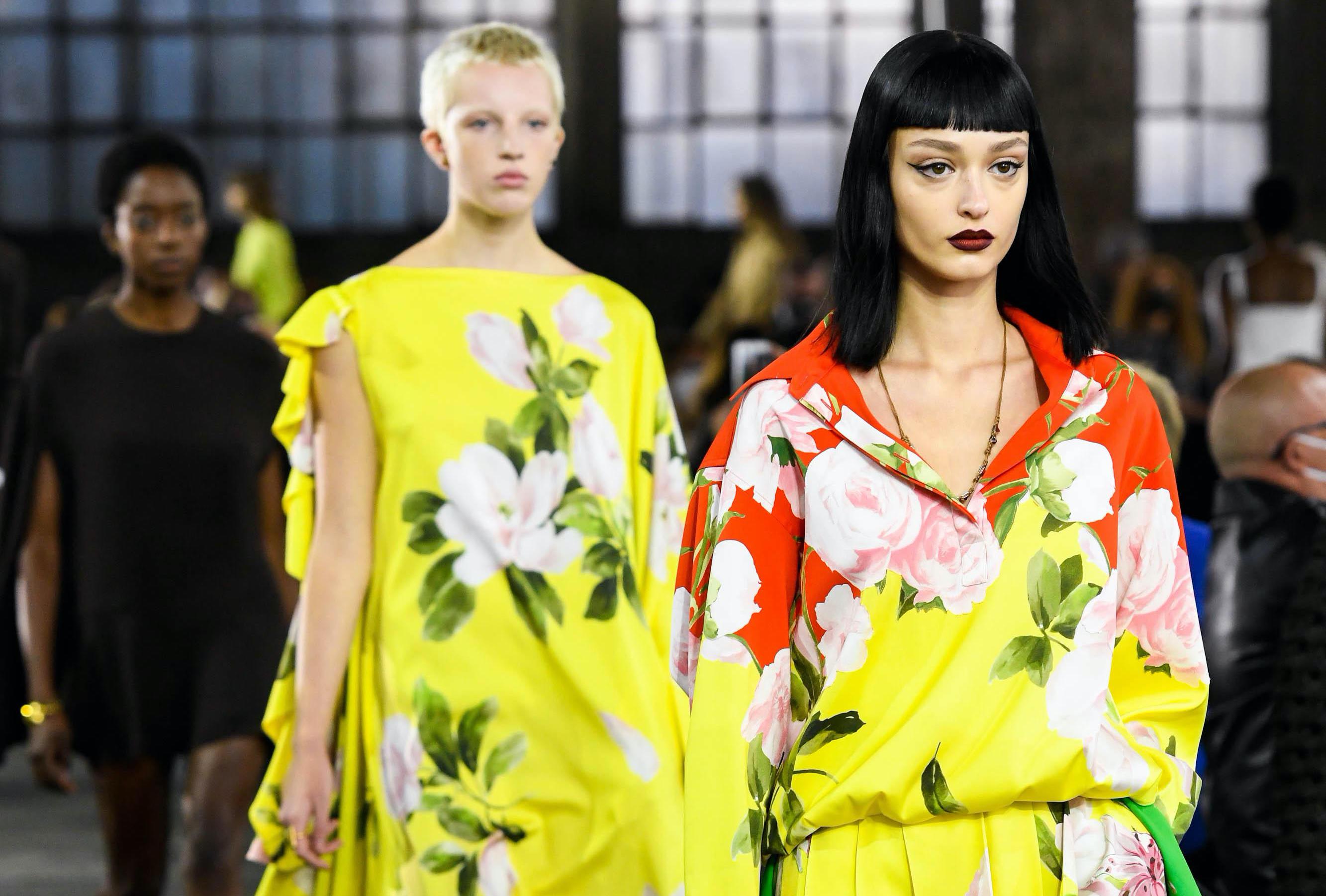 这种理念也展现到了服饰上。从大秀开始到结束,模特穿着的衣服由最初单调的黑色和白色,逐渐转变到愈发浓郁的柠檬黄色、鲜红色、墨绿色以及紫红色,展现的就是一个再度焕发生机的过程。这种转变你也可以面料和印花上看到,当飘逸的裙装越来越多、装点在服饰上的花卉越来越密集,整个秀场的氛围也会变得轻盈起来。