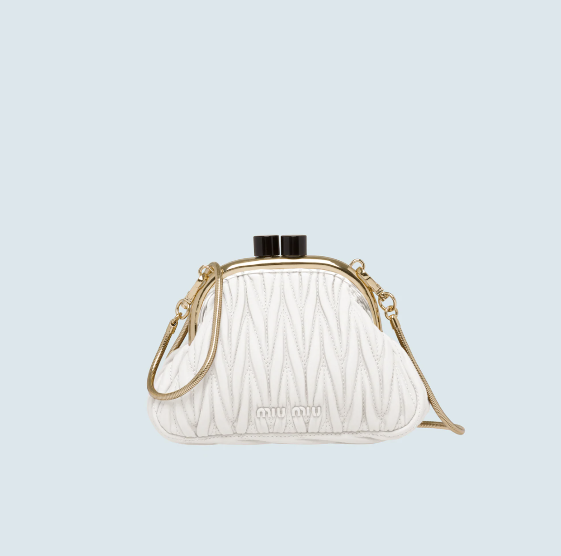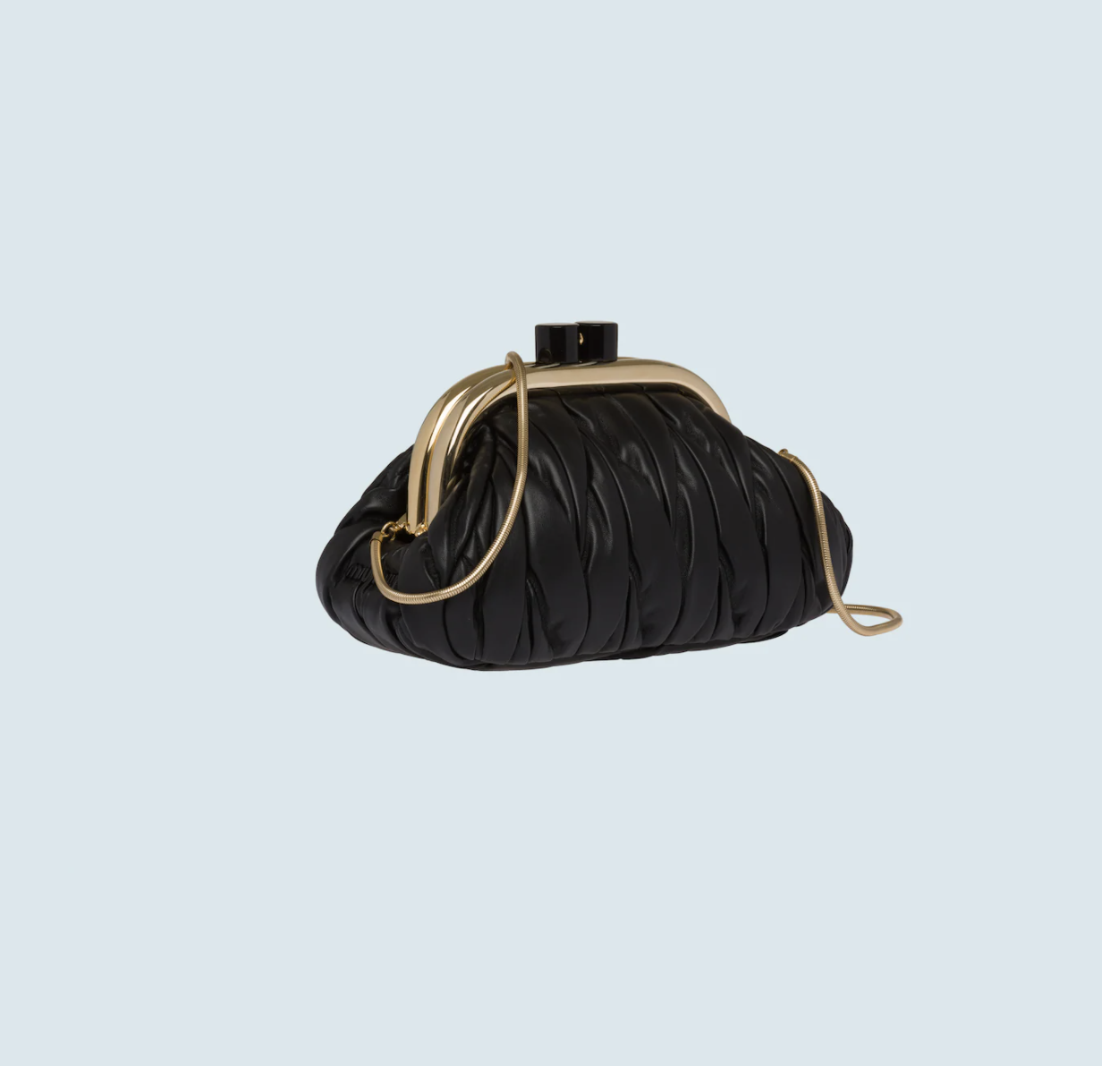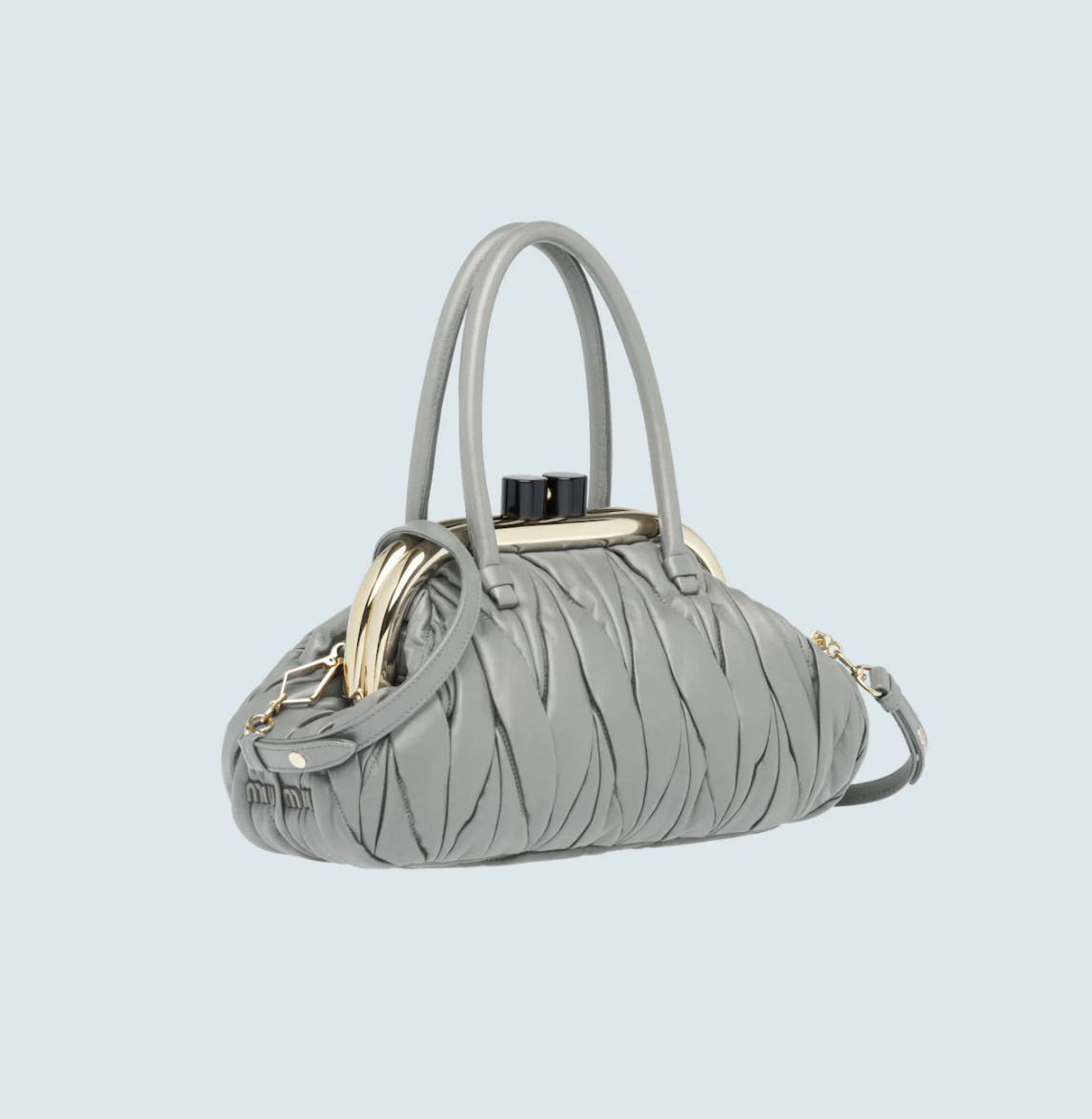 在外观上,Miu Belle无疑身处当下最火热的“饺子”形手拿包队列中,Miuccia Prada将梯形基础轮廓的两侧线条“掰弯”,并以开合处的凸起金属装饰和拉长的硬朗弧形提手,来使其呈现出有如复古钱包的模样。