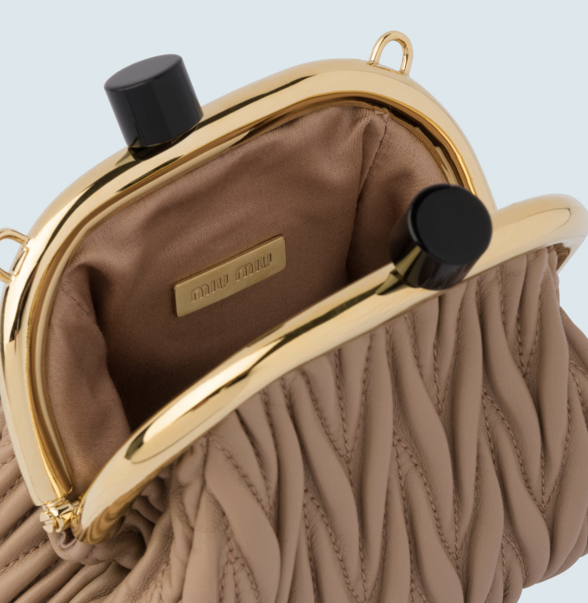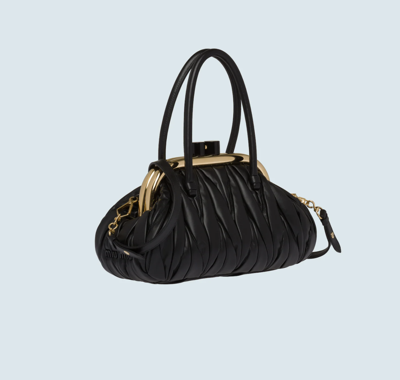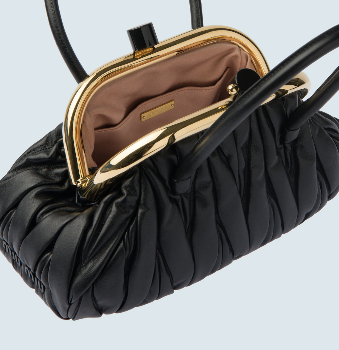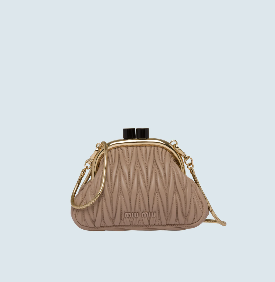 在外观上,Miu Belle无疑身处当下最火热的“饺子”形手拿包队列中,Miuccia Prada将梯形基础轮廓的两侧线条“掰弯”,并以开合处的凸起金属装饰和拉长的硬朗弧形提手,来使其呈现出有如复古钱包的模样。